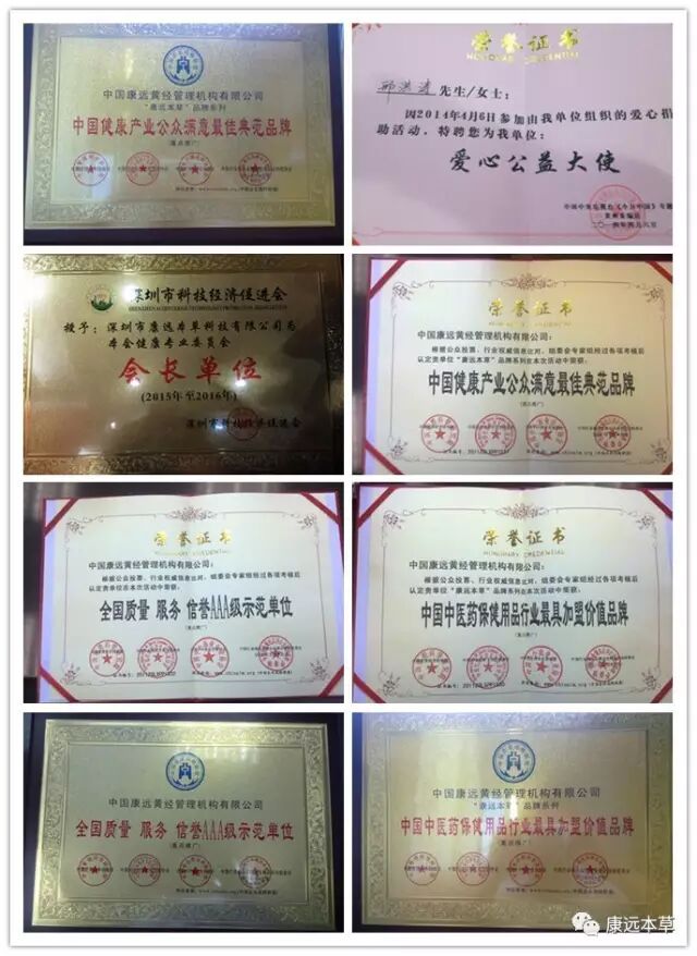 6、信誉优势:康远本草系列产品优良的品质得到了社会性的广泛认可,并经国家药品监督部门批准的“准”字号医疗新产品,通过国家质量体系认证获得了多项荣誉。